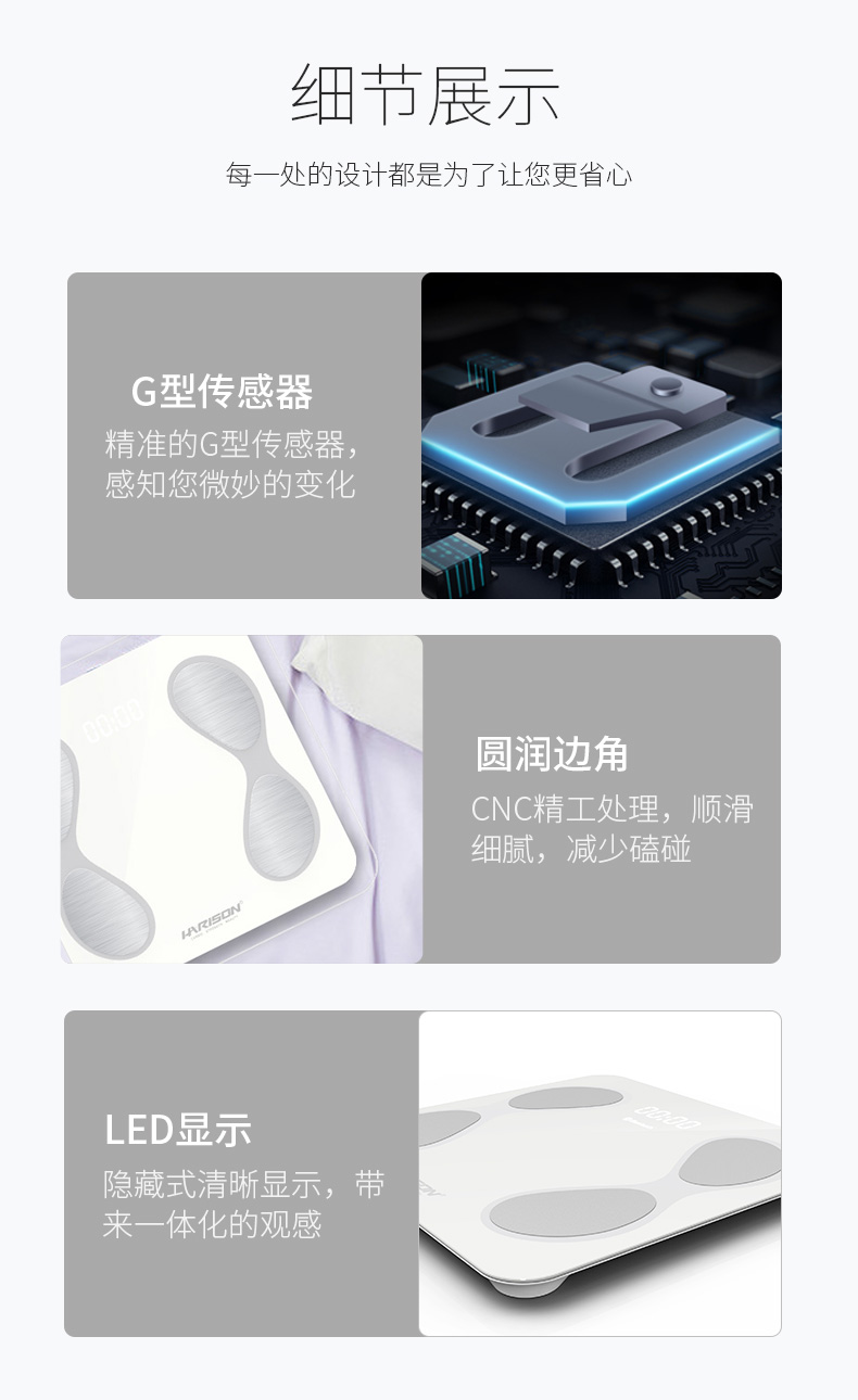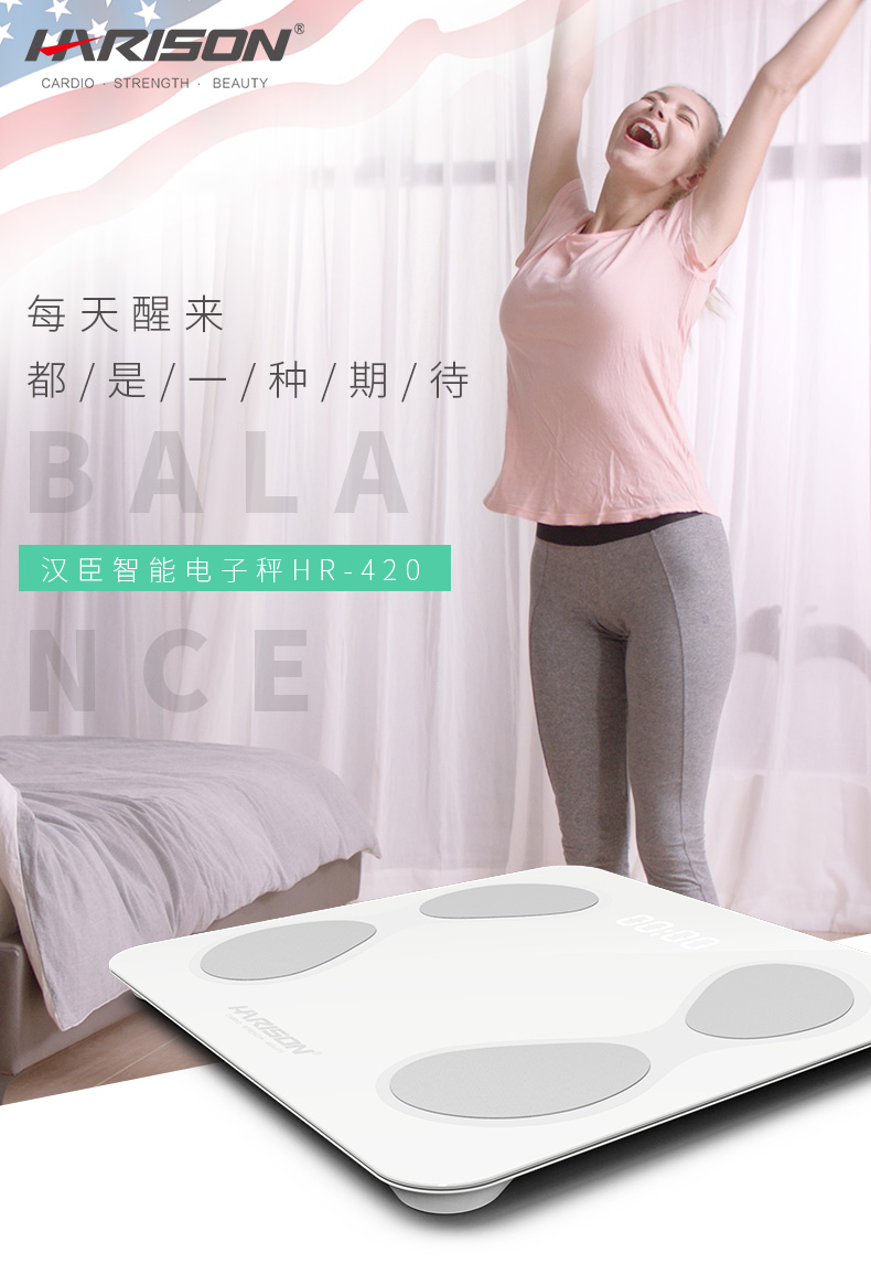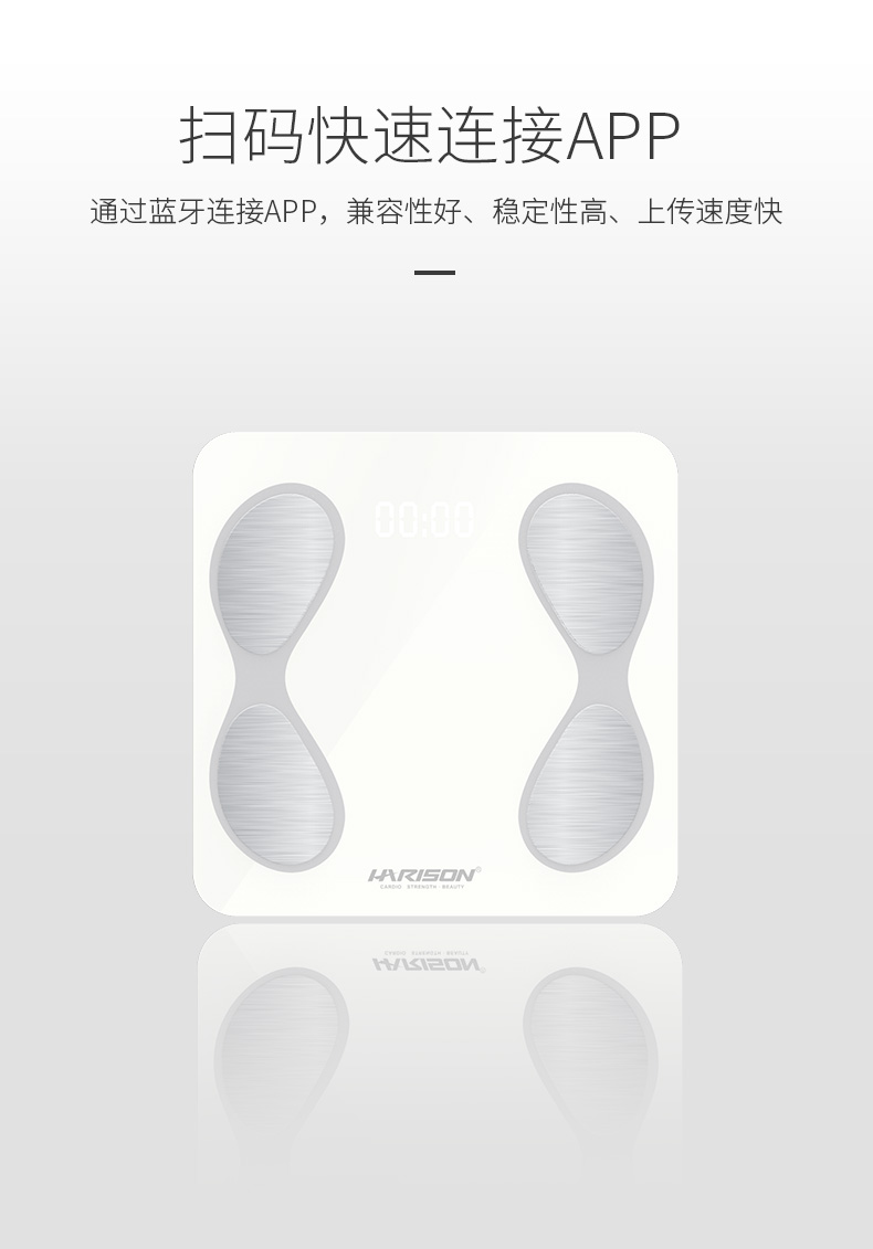 无论是使用还是外观上,美国汉臣HARISON智能蓝牙体脂秤都是一款简洁却充满美好体验的健身器材产品,大美至简,轻松融入家庭环境。