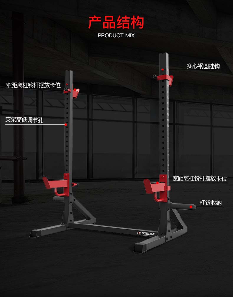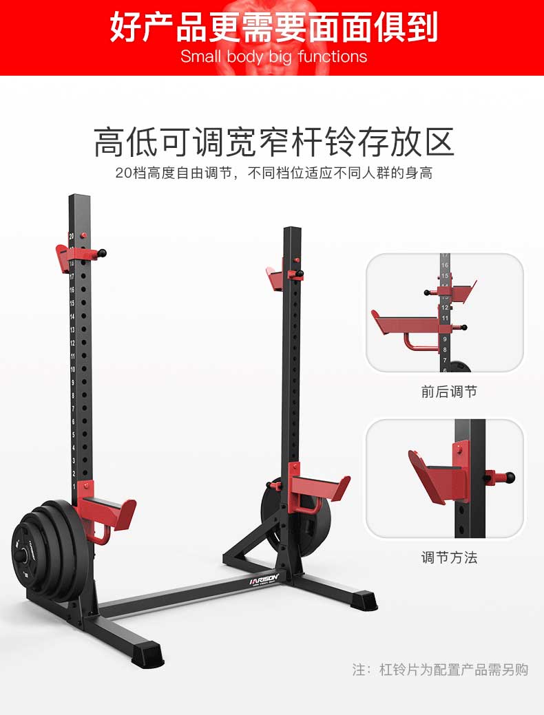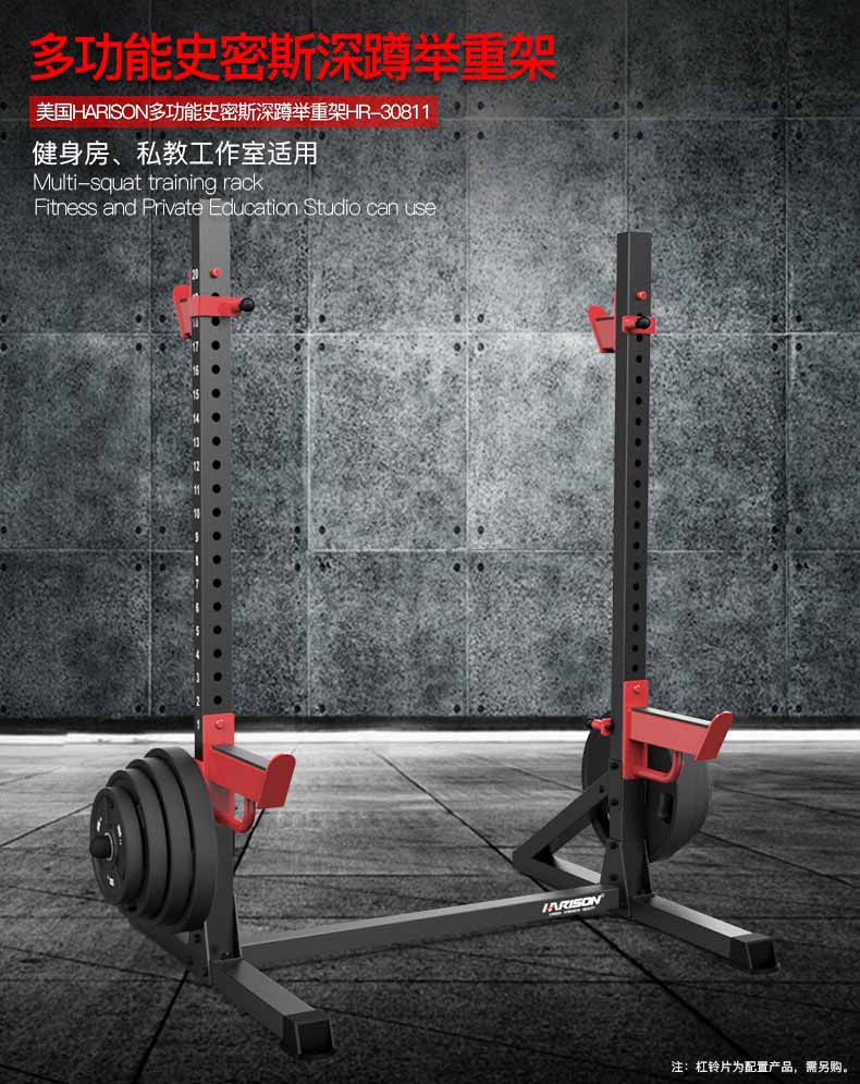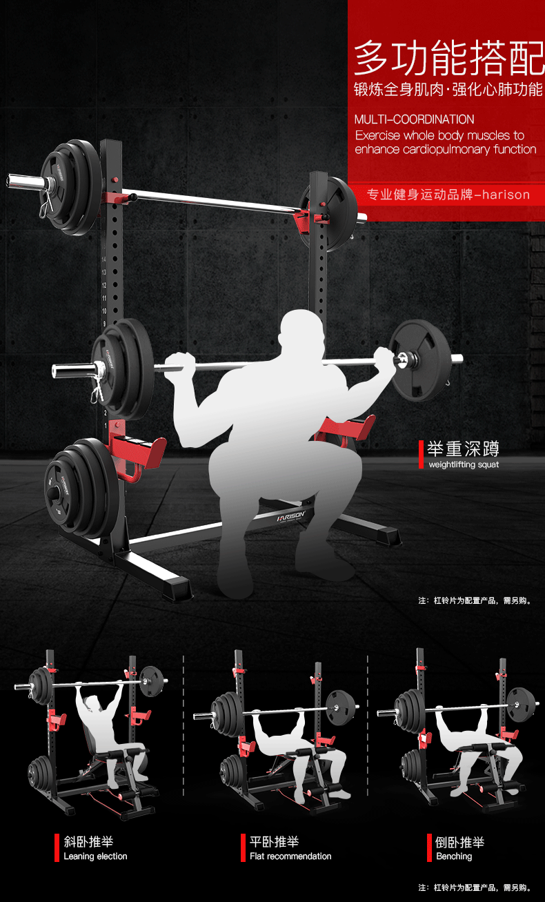HARISON 家用举重床 HR-30811是一个多功能史密斯深蹲举重架,它可适用于健身房、私教工作室。它虽然小身材,但不要瞧不起它,它有着大功能的优势。它可以多方位锻炼肌肉,哪里的多方位了,例如腹肌、臂肌、腿肌、胸肌。高低可调宽窄杠铃存放区、7mm厚钢材、2.0加厚钢管、实心钢圆坚固挂钩让你安全无忧虑锻炼各肌肉部位。