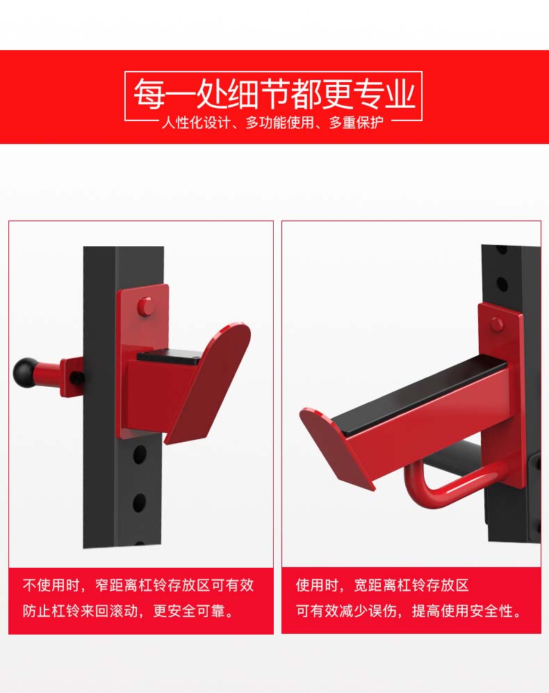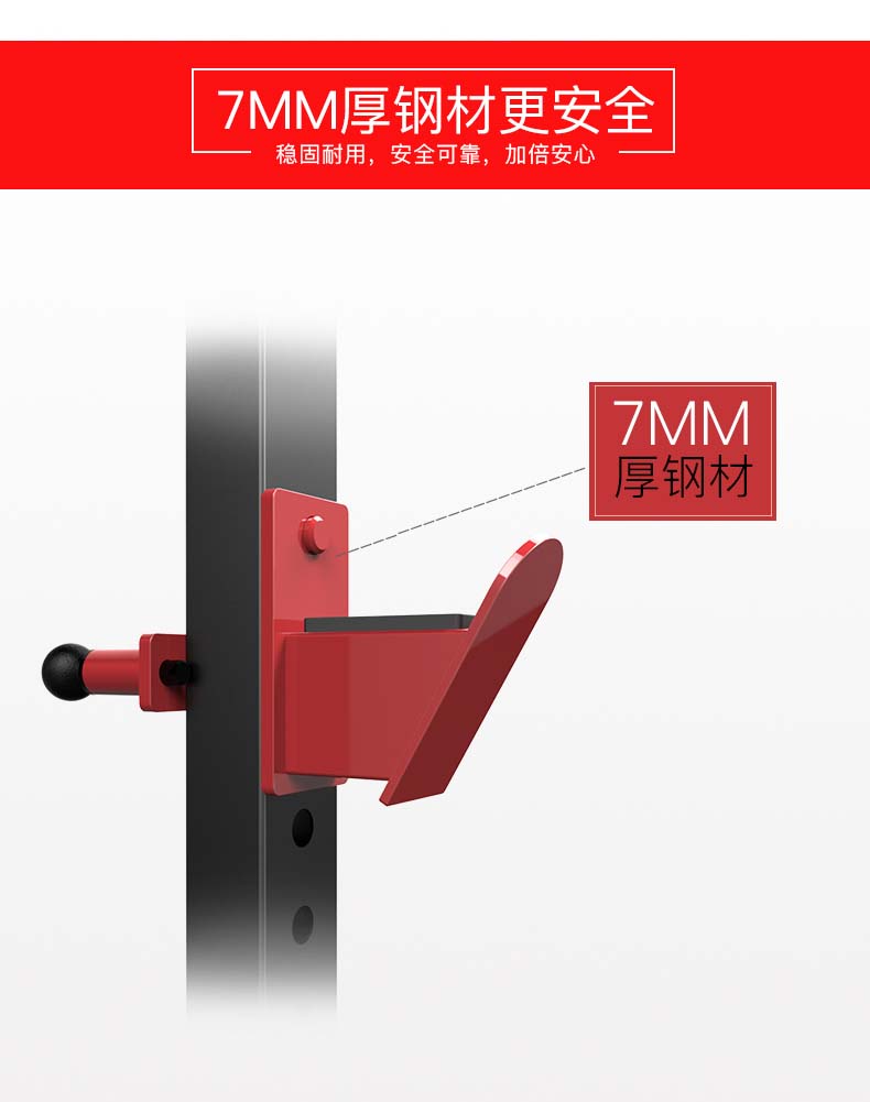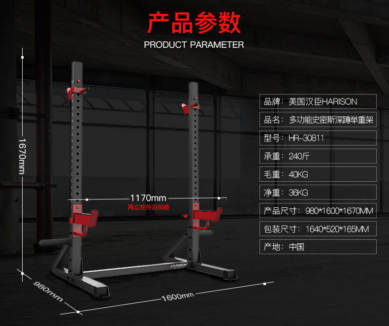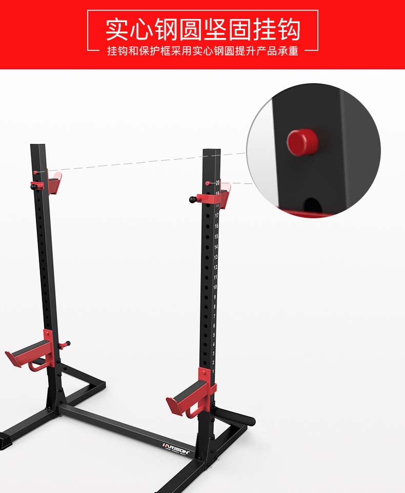 HARISON 家用举重床 HR-30811是一个多功能史密斯深蹲举重架,它可适用于健身房、私教工作室。它虽然小身材,但不要瞧不起它,它有着大功能的优势。它可以多方位锻炼肌肉,哪里的多方位了,例如腹肌、臂肌、腿肌、胸肌。高低可调宽窄杠铃存放区、7mm厚钢材、2.0加厚钢管、实心钢圆坚固挂钩让你安全无忧虑锻炼各肌肉部位。